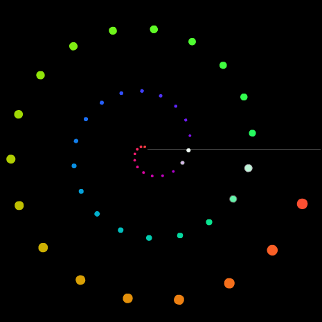 in three minutes, the largest dot will travel around the circle once, the next largest dot will travel around the circle twice, the next largest dot three times, and so on. the dots are arranged to trigger notes on a chromatic scale when they pass the line the music was generated using my own syd synthesis software, the animation was programmed in Processing